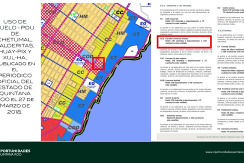 Como resultado de la reciente actualización al PDU, publicada en el Periódico Oficial del Estado el pasado 25 de Noviembre del 2021, la propiedad tiene un uso de suelo denominado como “Corredor Comercial Urbano (CCU)” el cuál permite la construcción de hasta 170 viviendas o departamentos o 100 cuartos/ha. neta vendible con usos mixtos en los niveles inferiores, comercial, de servicios y oficinas, alojamiento y servicios turísticos y del equipamiento equivalente al de los centros vecinales, de barrio y de subcentro urbano con una altura máxima de 12 niveles.
